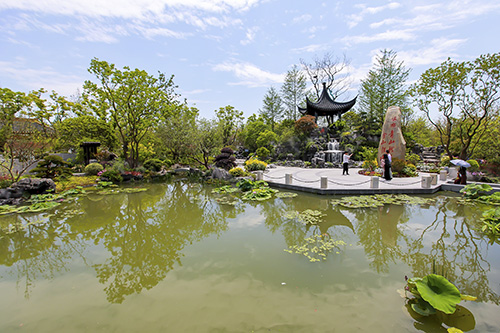 5月21日,浙江园开园当天,浙江省政协副主席周国辉、浙江省林业局局长胡侠、浙江理工大学党委书记吴锋民、浙江省林业局一级巡视员杨幼平、浙江省花卉协会会长邢最荣、杭州市园林文物局副局长唐宇力、8868·8868(中国)官方网董事长吴光洪、浙江理工大学风景园林系教授卢山、浙江园施工现场负责人吴小成在入口广场合影。