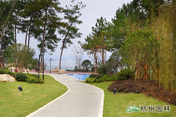 该工程位于浙江省淳安县千岛湖大石坪半岛,主要施工内容包括绿化种植、硬质铺装、景观土建、景观水电安装等。千岛湖以大旅游业为龙头的服务经济前景广阔,该酒店独具特色的绿化景观将成为千岛湖酒店服务领域的一大亮点。