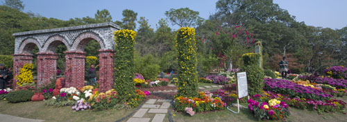 作品最大特色之处在于对原地形的充分利用及合理改造,依山势,按水理,精细打造每一个驻步休憩之所,搭配这种菊花,或色彩,或形状,以此营设自然而又不失韵味的菊花景观。最后,让人融入其中,步伐、气息、身影混杂交错,展示出城市生活中人们努力追求或回忆的一种起居文化,亦或是一种清净、淡雅的“和”文化。