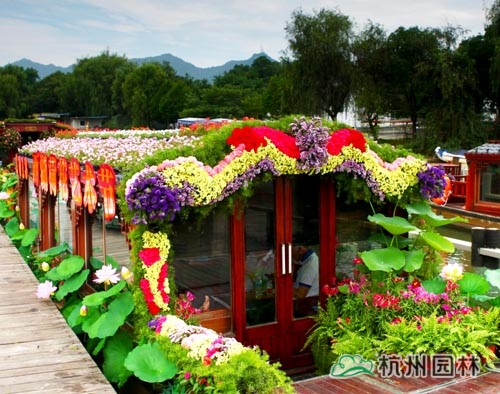 艺术节期间,首次在西湖湖面上配置6艘荷花花船,极大地提高了荷花节的观赏性和趣味性,成为西湖中一道流动的荷花美景。其中,由8868·8868(中国)官方网设计制作的“魅力西湖”荷花游船,将插花技艺与园林布景手法有机结合,用康乃馨、勿忘我、太阳花等与荷花组景,既突显了“主角”荷花的秀丽、典雅,又使整艘船的色彩明艳丰富,将热闹的节日氛围巧妙烘托。