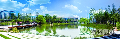 华为杭州二期生产基地景观工程位于杭州市滨江区。走进工程现场,只见一棵棵银杏、香樟、桂花生长得郁郁葱葱,昭示着无限的生机与活力;风格多样的铺装,相映成趣,蜿蜒延伸;波光粼粼的人工湖中,几只黑天鹅悠闲地游来游去,是风景的主角;色彩缤纷的黄色、白色、粉色花朵,营造出夏日的花海景观……不是公园胜似公园的园林美景,营造出一个郊外原野般的自然空间。