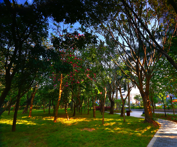 路旁绿地保留了2800多株冠幅茂密的原有乔木,根据地形又增加了不同规格的小叶榕、蓝花楹、凤凰木、宫粉紫荆、鸡蛋花等乔木,小叶紫薇、丹桂、四季桂、大红花等灌木,以及勒杜鹃、三色堇、红车、巴西鸢尾、花叶良姜、巴西野牡丹等地被和草花植物,形成丰富的植物群落。临近道路的边缘则片植红花夹竹桃、红花羊蹄甲等做背景,下层列植尖叶木犀榄等常绿灌木,形成繁花似锦的热闹景观。