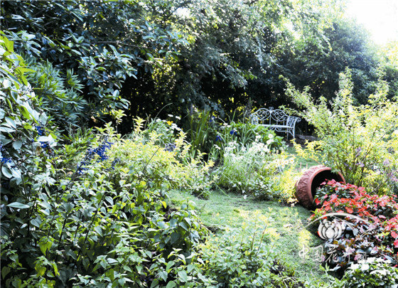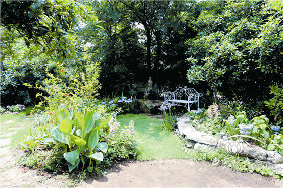 内部八仙花花园,以榉树、景石、石笼挡墙及园路围合成半开敞空间,以八仙花为主材,搭配鸢尾、石榴、落新妇、百子莲等,组成3个花境组团,与白色座椅形成半私密的花园景观。