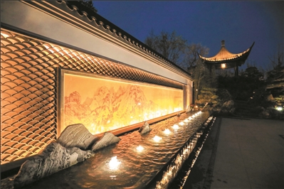 园区入口广场,迎面是一组水墨墙照壁,图案原型是“富春山居图”的一部分。