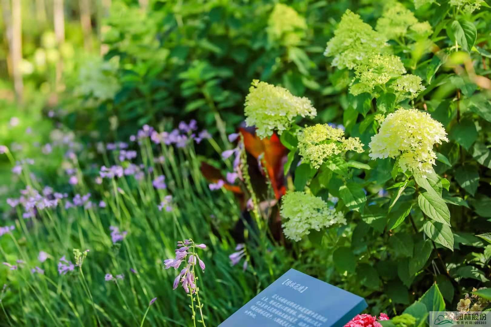 多个品种的绣球正次第开放,粉色、蓝色、紫色、白色等,五彩斑斓,绚丽多姿。