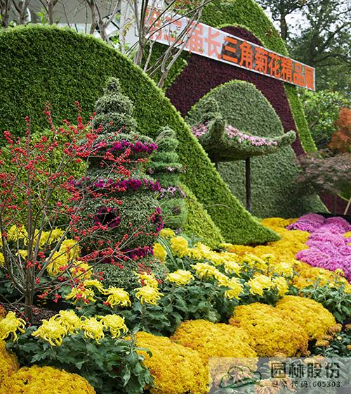 作品位于开幕式主舞台后方,杭州西湖的“三潭印月”、集贤亭;上海的“东方明珠”等长三角城市地标元素精彩出镜,与绚丽的菊花花海、盛放的三角梅、红果满枝的北美冬青等,绘就出一幅生机勃勃、共富共美的新气象。