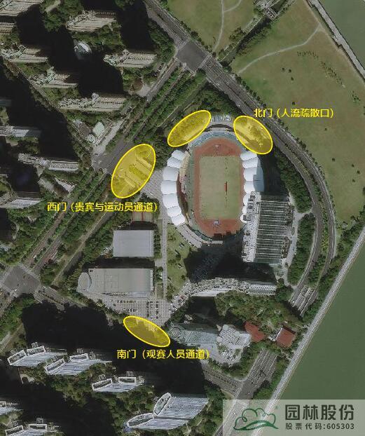 设计策略:对亚运场馆三个出入口进行景观提升,梳理中下层植被,布置足球主题装置小品或绿雕,配合特色花境花带和莳花,打造活力、欢快、热情的核心景观氛围。