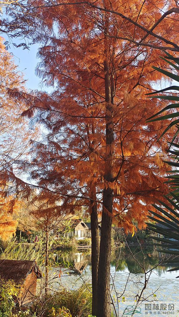 金黄的无患子、绚丽的红枫、黄红变换的枫香构成了画境园初冬缤纷世界的三部曲。半岛的乌桕、池塘对岸的水杉水松池杉混交林,则如跳动的音符,共同谱写着初冬的乐章。